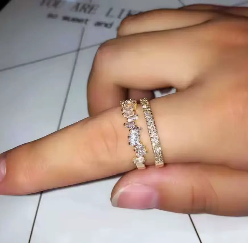 The Radiant Arc Ring is a symphony of light and elegance, designed for those who love to shine effortlessly. With its dual-layered design, one adorned with delicate pavé stones and the other lined with dazzling baguette-cut gems, this ring creates a mesmerizing play of brilliance. Crafted in luminous gold, it wraps around your finger with a graceful arc, embodying both sophistication and modern edge. Whether worn alone or stacked, this piece is a statement of timeless radiance.