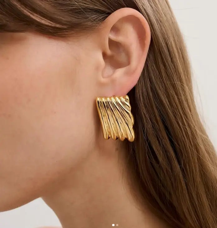 Inspired by the mesmerizing flow of ocean waves and the ethereal glow of the aurora, the Aurora Waves Earrings embody movement, elegance, and timeless beauty. Crafted with high-quality gold plating, their fluid, ribbed design mimics cascading waves catching the light, creating a radiant shimmer with every turn.