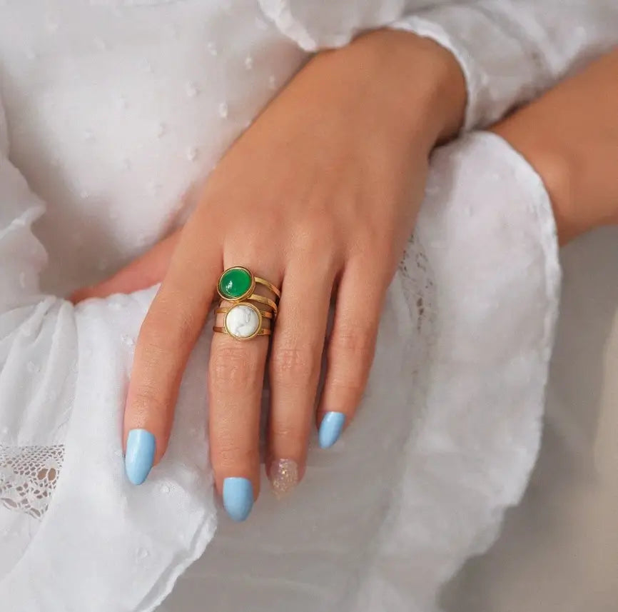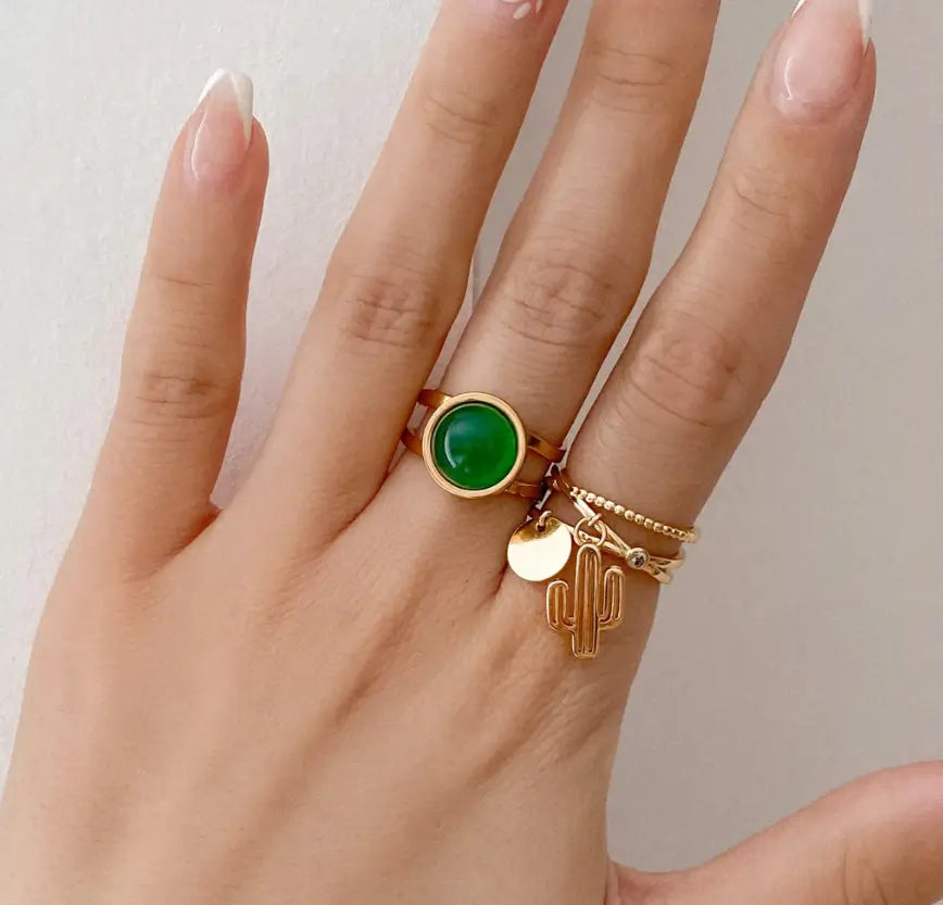 A statement of elegance and serenity, this gold ring features a captivating green stone that radiates a timeless charm. Designed to stand out, it adds a touch of sophistication and grace to any look.