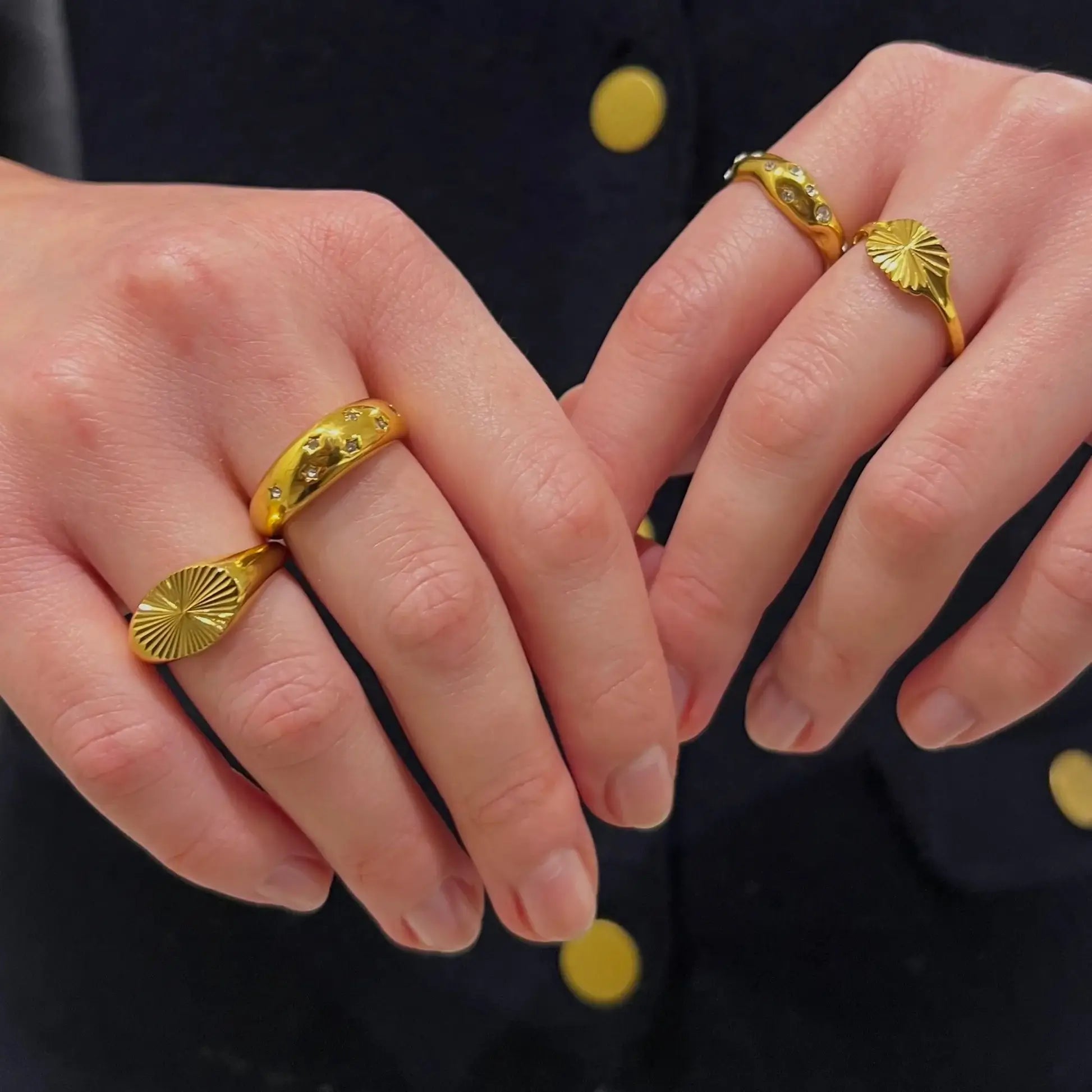 Inspired by the beauty of the night sky, the Celestial Drip Ring features a fluid, organic shape adorned with scattered, twinkling gemstones. The wavy gold band mimics the natural flow of molten metal, creating a unique and elegant silhouette. Each shimmering stone catches the light, resembling stars scattered across a dreamy celestial canvas. Whether worn alone for a subtle statement or stacked for a bolder look, this ring adds a touch of cosmic elegance to any outfit. Perfect for those who love effortless luxury with a modern twist. ✨