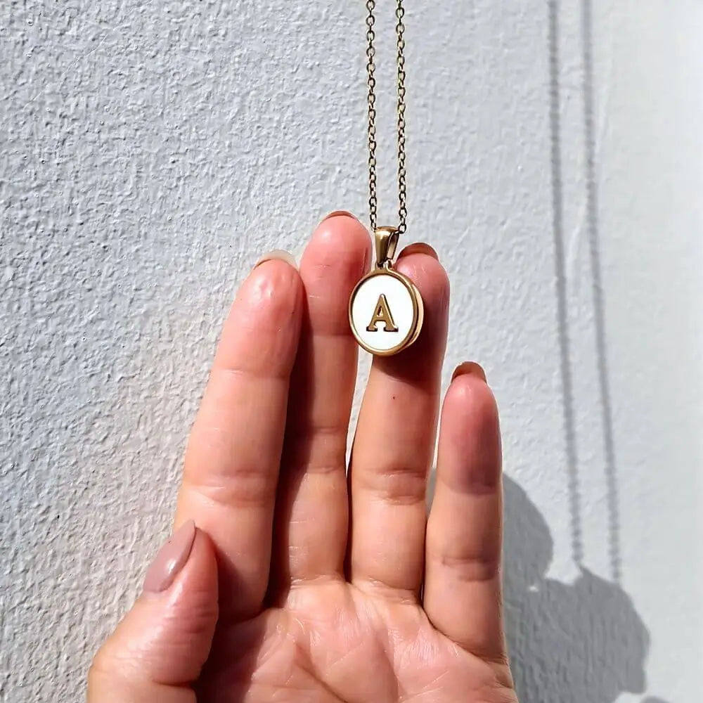 Lustre Initial Necklace – A timeless piece with a personal touch. This elegant gold-plated necklace features a sleek oval pendant with a glossy white enamel background, beautifully highlighting the raised gold initial at its center. Designed for everyday wear, the Lustre Initial Necklace adds a touch of sophistication and individuality to any outfit. Perfect as a meaningful gift or a signature piece for yourself.