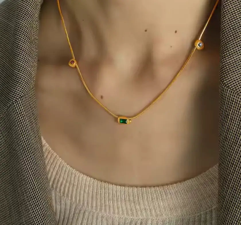 A radiant fusion of elegance and modern design, the Golden Orbit Necklace features a beautifully layered look with a sleek snake chain and a delicate fine chain. Accented with bezel-set gemstones in rich hues, each stone appears to float effortlessly, adding a celestial charm to your style. Crafted in gold for a timeless glow, this necklace is perfect for layering or making a statement on its own.