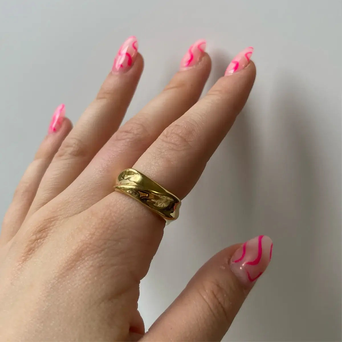 A bold statement of effortless elegance. This gold-plated ring features a fluid, sculptural design that catches the light beautifully, creating a dynamic interplay of shine and shadow. Its organic curves offer a modern yet timeless appeal, making it the perfect piece for those who love striking, artful jewelry. Whether worn alone or stacked, the Amelie Band Ring adds a touch of sophistication to any look.