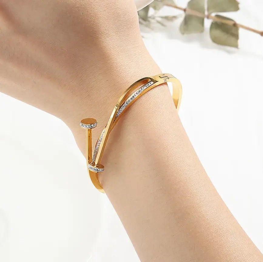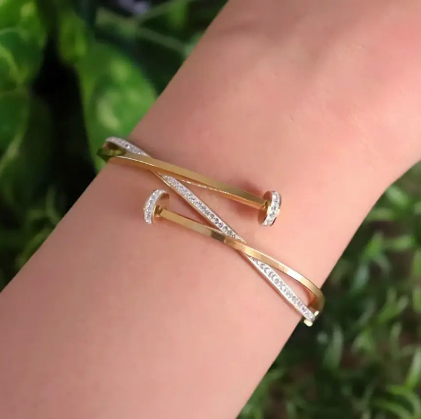 Like the gentle intertwining of fate, the Golden Embrace Bangle captures the essence of unity and elegance. Its fluid, interwoven design represents strength and harmony, while the delicate sparkle of stones reflects the beauty found in life’s finest moments. A timeless piece that wraps your wrist in radiance, reminding you that true elegance lies in the details.