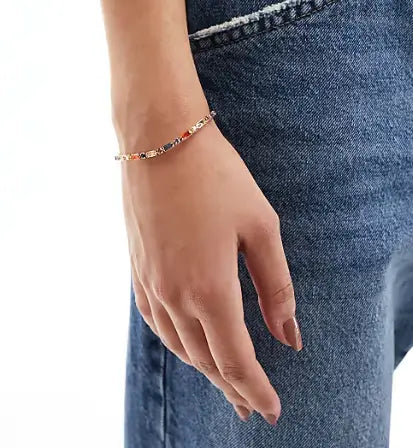 Add a touch of elegance with the Celestial Prism Bracelet, featuring vibrant baguette-cut gemstones set in a luxurious gold-tone frame. The colorful stones catch the light beautifully, creating a dazzling rainbow effect.